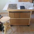 La tablette auxiliaire (l’une des options du meuble atelier) vient se positionner sur ce plateau, à droite ou à gauche.